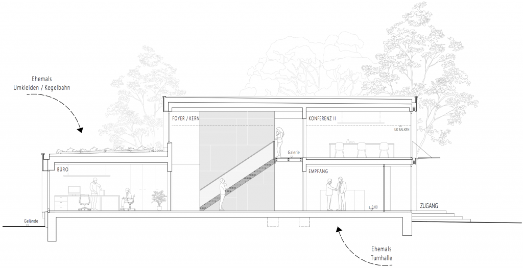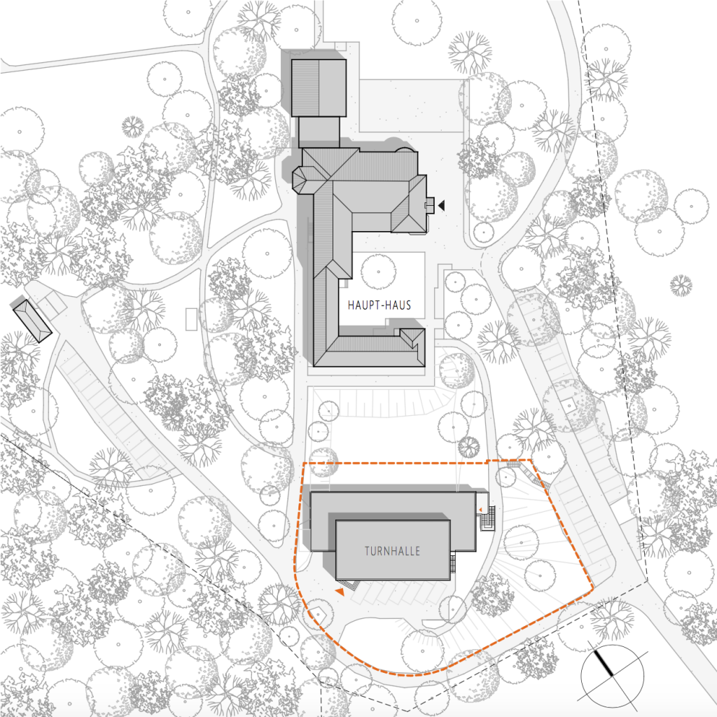 Mitten im Grünen ruht ein 1903 errichtetes Anwesen. Nach diversen Transformationen wird es heute als Büro- und Verwaltungsgebäude genutzt. Da das Haupthaus im Laufe der Zeit zu klein für den Expansionsdruck der ansässigen Firmen geworden ist, entschied sich die Bauherrenschaft die zum Anwesen gehörende Sporthalle umzunutzen.